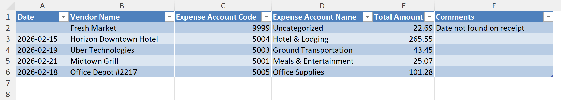 - If Date is missing, leave it blank and add "Date not found on receipt" in Comments.