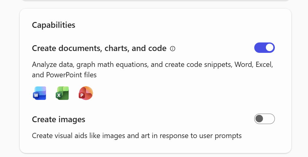 In the Capabilities section, turn on Create documents, charts, and code. This is required because the agent must generate and return an actual Excel workbook. Without this enabled, it would only be able to respond with text.